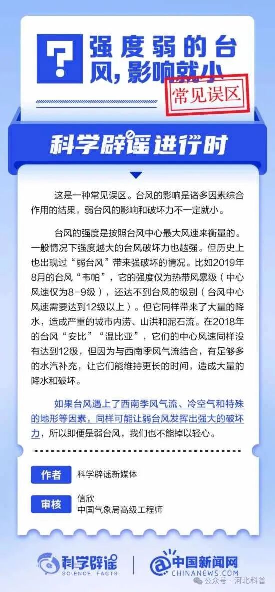 强度弱的台风,影响就小?台风的影响是诸多因素综合作用的结果,弱台风的影响和破坏力不一定小。台风的强度是按照台风中心最大风速来衡量的。一般情况下强度越大的台风破坏力也越强。但历史上也出现过“弱台风”带来强破坏的情况。如果台风遇上了西南季风气流、冷空气和特殊的地形等因素,同样可能让弱台风发挥出强大的破坏力,所以即便是弱台风,我们也不能掉以轻心。 |